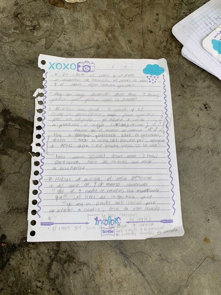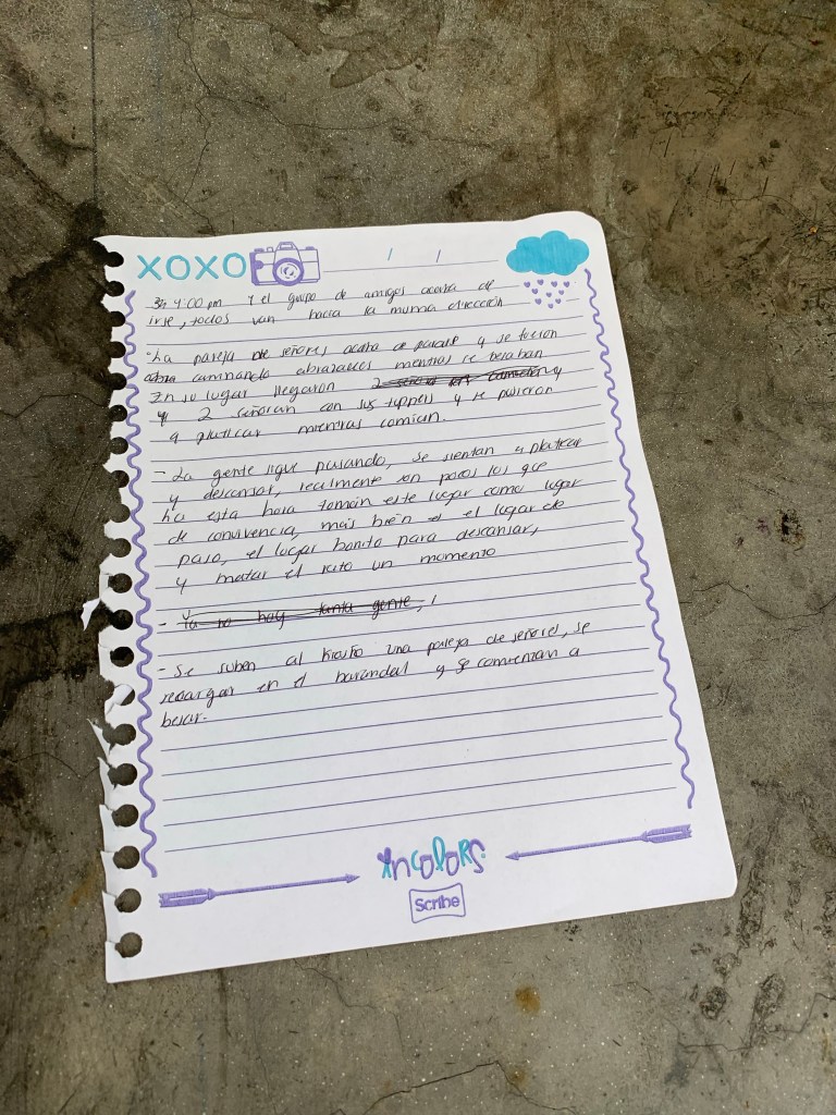 Un hombre oficinista caminaba con una bolsa de papel de Burguer King va en rumbo contrario de la mujer. La vista se queda vacía por un momento, dos hombres se nos acercan de forma acelerada, empieza a explicar, uno a la pareja, otro a mi amigo y a mí, que no han comido y que si les podemos dar para un taco, mi amigo solo asiente con la cabeza y le da unos cuantos pesos, el hombre se percata de los dulces en el suelo, me pide uno, se lo doy y despues me pide otro, se lo entrego y ambos se van. Un grupo de tres hombres y una mujer con ropa deportiva charlan mientras caminan en dirección a plaza Juárez, en dirección opuesta unas chicas de entre quince y diez y siete años caminan tomadas de la mano, una usa una falda de mezclilla y unos zapatos con estampado de sandía. Un oficial paseaba alrededor, golpeó levemente un poste de luz con su puño y siguió caminando. Un grupo de tres hombres de traje con gafetes caminan mientras el más jóven pregunta “¿Si nos vemos el viernes?” los otros dos hombres asienten con la cabeza y hacen ademanes con las manos. Las personas de ropa deportiva regresan pero esta vez con cuatro vasos de Starbucks, siguen su camino por donde llegaron la primera vez. Dos hombres y una mujer hablan en ingles, traen mochilas y usan ropa cómoda como shorts y leggins, así como sombreros pesqueros, toman fotografías. Un hombre de camisa blanca desfajada, jeans, tenis y una gorra roja de gobierno se acerca y habla directamente para los chicos a mi lado y para nosotros, empieza con un discurso en el cual nos pide dinero ya que, lo necesitan para el auxilio de una niña de la calle que habían atropellado cerca de su casa en Tepito, el discurso dura poco más de 3 minutos, todos le damos dinero, él agradece y se marcha. Unos minutos después la pareja a nuestro lado se retira.