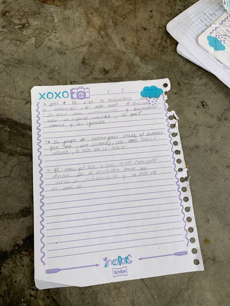 Lo primero que veo cuando llegamos es un travestí con unas medias de red que caminaba desde la fuente hacia la avenida, pasaron unos minutos para que comenzaran a pasar más personas. Una señora mayor de treinta años caminaba con dos niñas de uniforme de la mano. El turibus se detiene sobre la avenida y el la parte superior se encuentran no más de siete personas de piel blanquecina. Una mujer con el ojo izquierdo lastimado se acerca a la pareja a mí lado izquierdo y dice unas palabras casi imperceptibles; usa una blusa rosa intenso, unos pantalones caqui, unos tenis percudidos, el cabello recogido y sobre este una gorra de mezclilla, extendió el brazo con lo que parece una alcancía con forma de tortuga y dice las siguientes palabras: “No me da una monedita para pagar mi renta es que no me alcanza”, los chicos se niegan, la mujer se acerca a nosotro pero mi amigo se niega de igual forma.