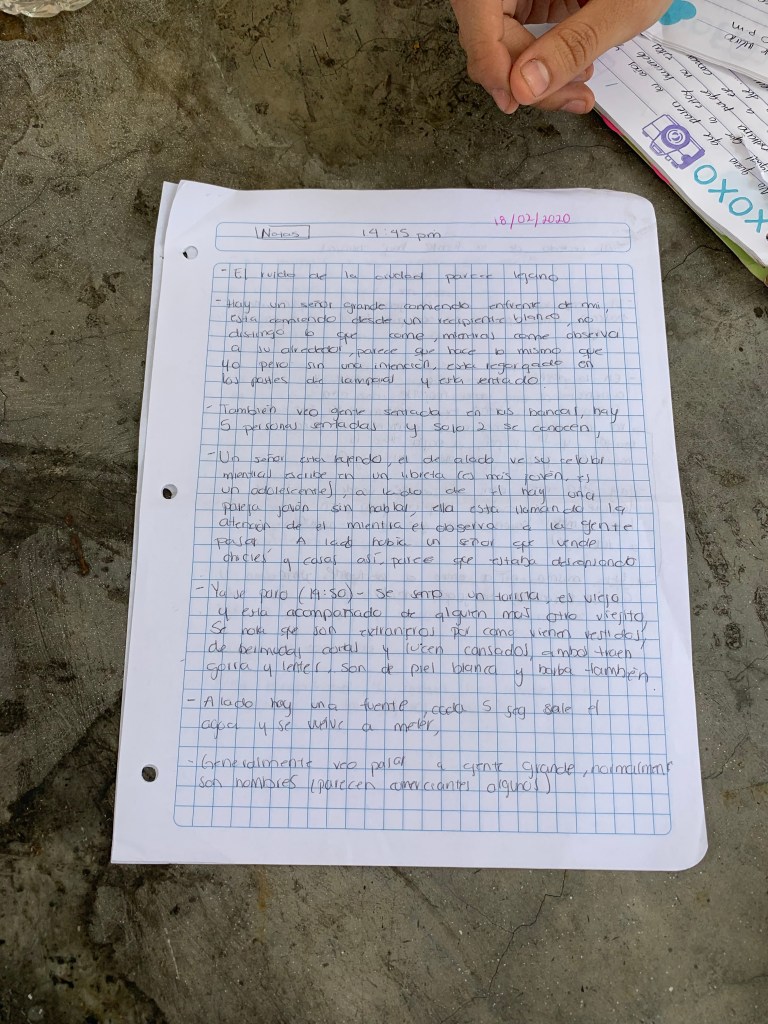 Son las 16:30 de la tarde. Estoy acompañado de mi compañera Dafne Rodriguez. Hace menos calor que en las otras dos ocasiones que he venido. Estamos en la sombra y el clima es agradable. El termómetro marca 23°C y el cielo está despejado. En esta ocasión, nos ubicamos en una pequeña glorieta, enfrente de una fuente que tiene al centro la escultura del dios Poseidón. Lo notas por el tridente que tiene. A mi costado, se encuentra una pareja de novios de alrededor de 50 años, están muy cerca platicando, y besándose mucho. El hombre está encima de la señora que está sentada, se le acerca mucho y casi casi la aplasta. A nuestro costado derecho, parece una pareja de amigos platicando muy tranquilos. A ellos se les acercó un vago, pidiéndoles su agua, ellos se la regalan aunque ya no tenía mucho. Se acercan unos trabajadores de limpieza de la ciudad de México y observan el piso que está sucio de algo, se ponen a analizar como limpiarlo, y al mismo tiempo observan curiosos a la pareja de novios de nuestro costado, y se ponen en acción. Uno de ellos echa agua y jabon desde donde estamos nosotros hasta la fuente, mientras el otro talla. Tres cubetazos de agua bastaron para limpiar esta parte del piso, posteriormente el que aventaba el agua, comienza a tallar también. Al fondo, otra compañera suya barre con las escobas de madera. Terminan su labor de este pedacito de suelo, y se retiran; dejaron en el suelo una colilla de cigarro. El hombre de 50 años se retira de encima de su pareja y se sienta y comienza a platicar. Pasan dos chicas corriendo, llevaban un gafete de trabajo. Un chico con bicicleta está sentado en la orilla de la fuente, con una mochila. Más a la derecha, en otra banca, esta otra pareja de novios de aproximadamente 25 años, el chico muerde a la chica jugando y ambos se ríen, el chico la abraza y siguen jugando. Enfrente de nosotros, un chavo se toma una foto en la fuente, parece que es su mamá con la que viene. En la banca de nuestro costado derecho, también está un hombre que se queda dormido. Pasan un grupo de amigos con patinetas y un ciclista a toda velocidad. Hay varias personas usando el celular. A pesar de que pasan varias personas, el flujo es menos constante que en fin de semana, y el ambiente se respira mucho más tranquilo; hay menos movilidad y es más fácil escuchar el ruido de la fuente aventando agua. Es curioso que a pesar de ser entre semana, el trafico de avenida Juarez es ligero. Casi no he escuchado claxons y no se ven embotellamientos. El viento sopla fuerte por un momento y siento un poco de la brisa de la fuente. Se acerca una mujer de aproximadamente 35 años a mi compañera Dafne a querer hacerle una encuesta sobre sopa instantánea, pero al negarse mi compañera de consumir eso, se retira, y busca a otra persona para encuestar. Se escucha una ambulancia al fondo que va sobre el Eje Central. Pasa un grupo de amigos y amigas que empieza a jugar un poco con el agua de la fuente a mojarse, pero es muy leve. Tanto la pareja de la banca de nuestro costado derecho como el hombre que se estaban quedando dormidos, se retiran. Escucho gritos de niñas frente a nosotros pero en la siguiente fuente, y me percato de que se están mojando en ella. Se divierten bastante. Corren hacia esta fuente y se van para nuestra espalda. Otro grupo de amigas se toma fotos enfrente de nosotros. Y un grupo de amigos de como 16 años está sentado en la orilla de la fuente. Uno de ellos se levanta y moja a todos. El mismo empuja a uno a la fuente y los demás se empiezan a reír de él. Al que avnetaron tratan de salir de la fuente lo menos mojado posible y corretea al que lo aventó, mientras los otros se ríen y uno de ellos grita «se pasó de verga» Algunos observan el hecho y se ríen de forma más discreta. El mismo grupo de amigas que se esta tomando fotos se reúnen en otro costado de la fuente y empiezan a hacer ligeros pasos de baile. Son aproximadamente 7. Comienzan a señalar a diferentes partes y se empiezan a despedir. La pareja de nuestro costado izquierdo también se retira. Las amigas se quedan platicando otro poco después de despedirse. Se agrega un hombre a ellas. Los trabajadores de limpieza de la ciudad regresan a lavar la banca de nuestro costado izquierdo, atrás de done están las amigas. Pasan dos amigos extranjeros por enfrente de nosotros con una pizza de Little Caesars y van hablando en Inglés. Otro chavo enfrente de nosotros se toma una selfie en la fuente. Se nos acerca un estudiante de la facultad de psicología a querer hacernos un estudio pero le decimos que también estamos en un trabajo y se retira amablemente. Pasa una persona con una eco bici y playera de la selección mexicana a toda velocidad, al igual que otros dos patinadores con distintivos del IPN. Pasa una pareja con su bebé y se ponen en la orilla de la fuente para que el bebé esté cerca del agua. Lo acercan a ella un momento y se retiran. Los trabajadores de limpieza terminan sus labores en ese costado de la fuente y las amigas ahora si se separan a la mitad y se dirigen a caminos opuestos. Llega un vago al costado donde estaban los trabajadores y se acuesta a dormir en la banca. Llega una familia de cuatro integrantes, donde hay un bebé que se quiere meter a la fuente pero no lo dejan. Su hermana lo lleva hacia otro lado y lo toma de la mano. Pasan tres ciclistas que parecen extranjeros, dos de ellos reciben una explicación del tercer ciclista, que también parece extranjero. Los trabajadores de limpia siguen con sus labores en otro costado de la fuente. Se escucha el sonido de las aves. Los extranjeros se retiran. Escucho detrás nuestro una música ligera, parece beat de rap. Volteo y veo entre los huecos de las bancas a dos chavos parados haciendo gestos de que están haciendo rimas. El aire se siente un poco más frío y la luz del sol se empieza a recorrer hacia nuestra derecha. Y como no traigo chamarra y el aire refresca, y mi compañera está e
