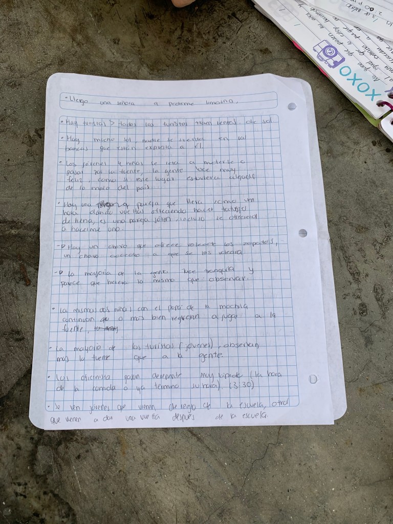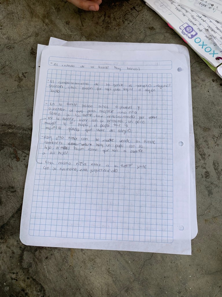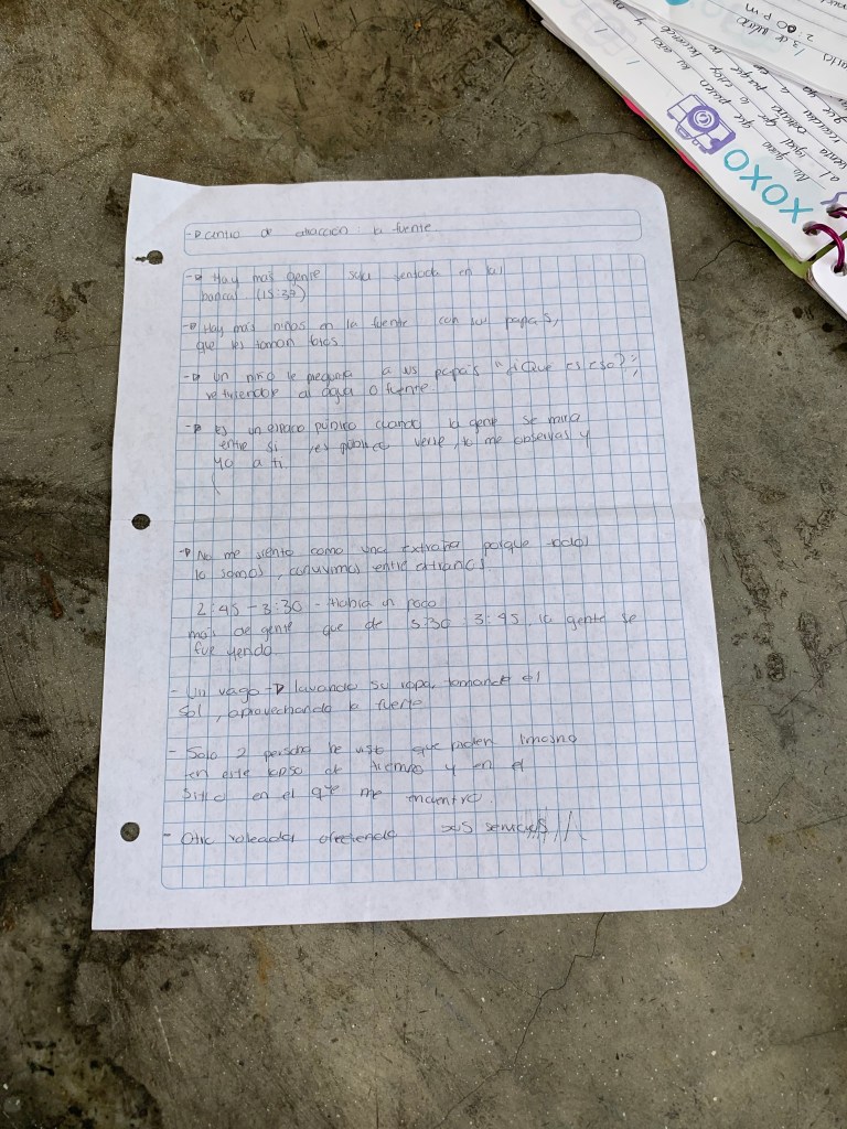 Las horas van pasando y la gente llega y se va, hay muchos niños ya, todos corren hacia las fuentes y otros solo caminan en busca de algo que los entretenga. Hay parejas sentadas, hay una a lado mío y parece que acaban de pelear.