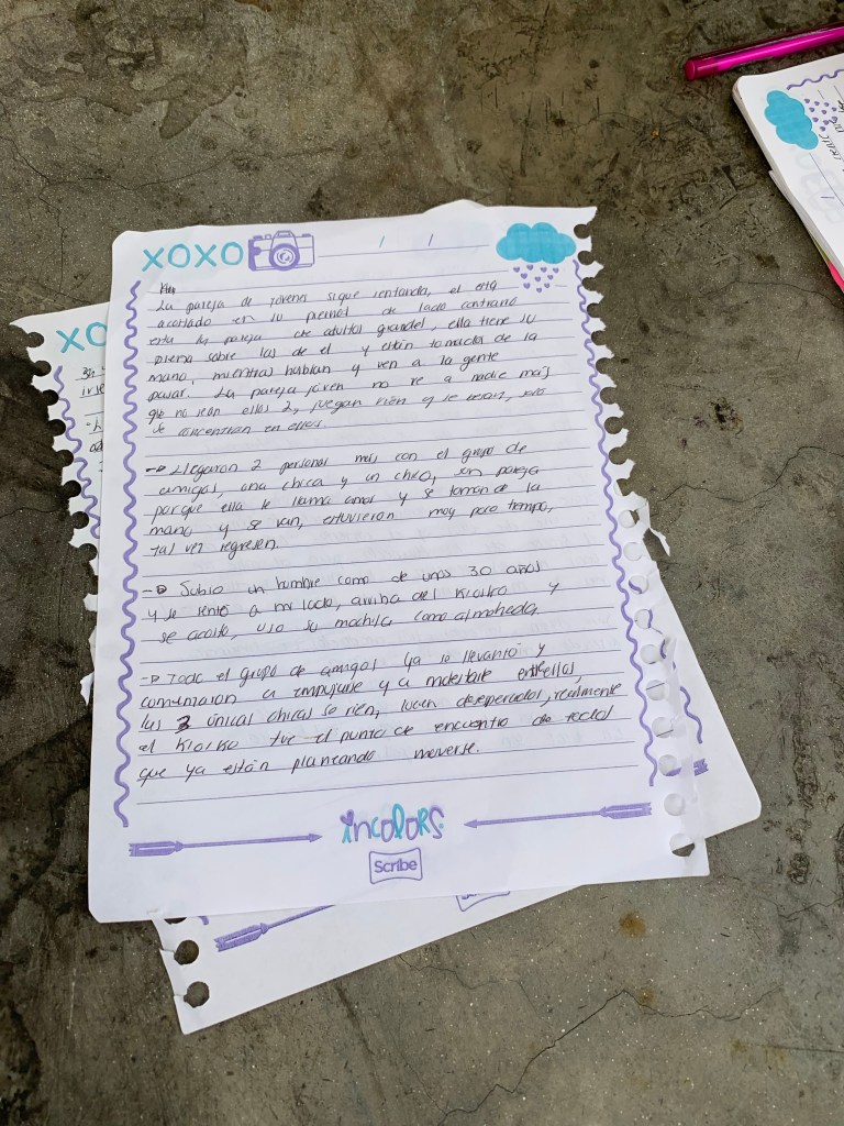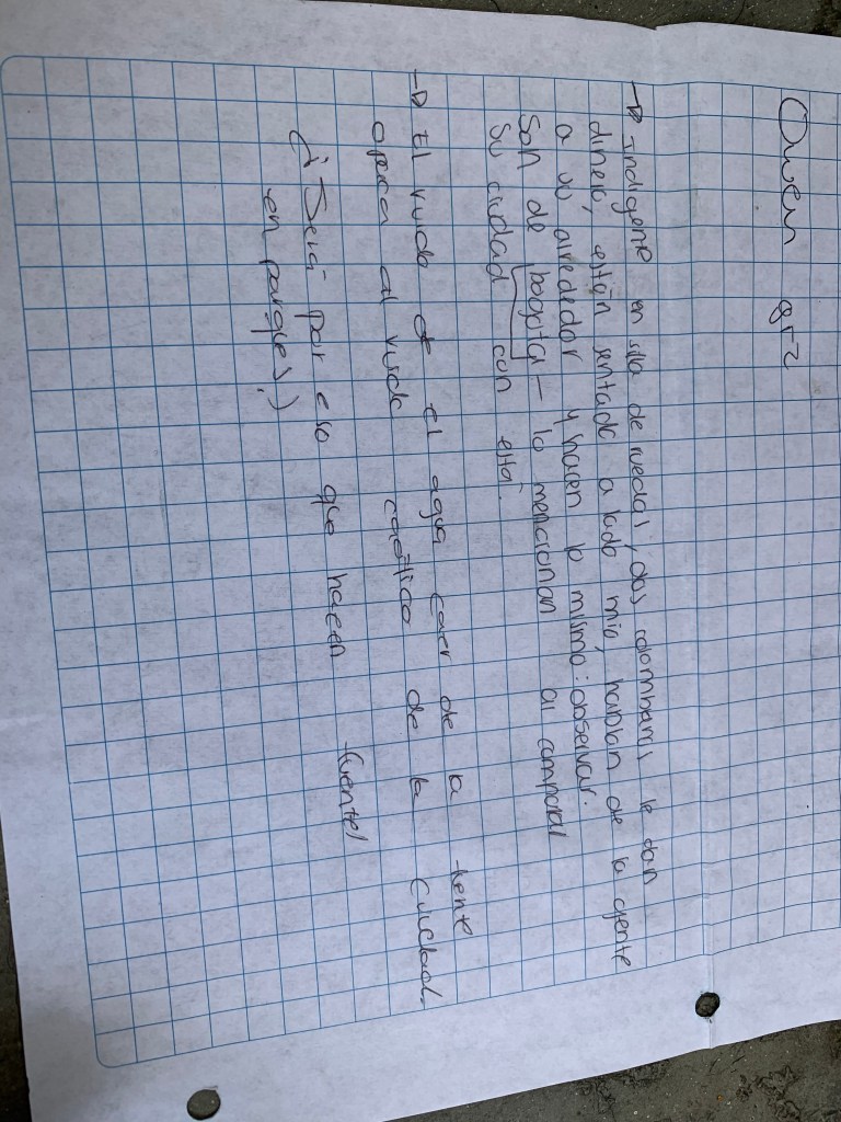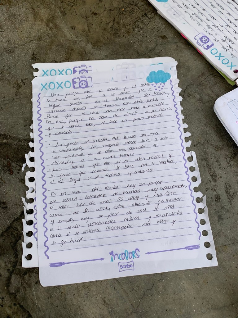 Un señor ya grande está sentando solo, me senté a lado de él y me pregunto qué tanto escribía. Le dije que solo me gustaba escribir lo que veía. Y me dijo “¿vas a escribir de mi?”, lo dijo con mucha dulzura. Era un señor con muchas canas, gordito, y vestido con camisa blanca fajada y unos pantalones negros. Le respondí que si escribiría sobre el, me sonrió y me dijo “eso me parece bien”. Bajo la mirada y me dijo “ bueno muchacha, hay me cuentas que escribiste”, y se para y se va. Para ese entonces ya eran las 8 de la noche.