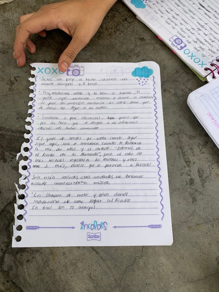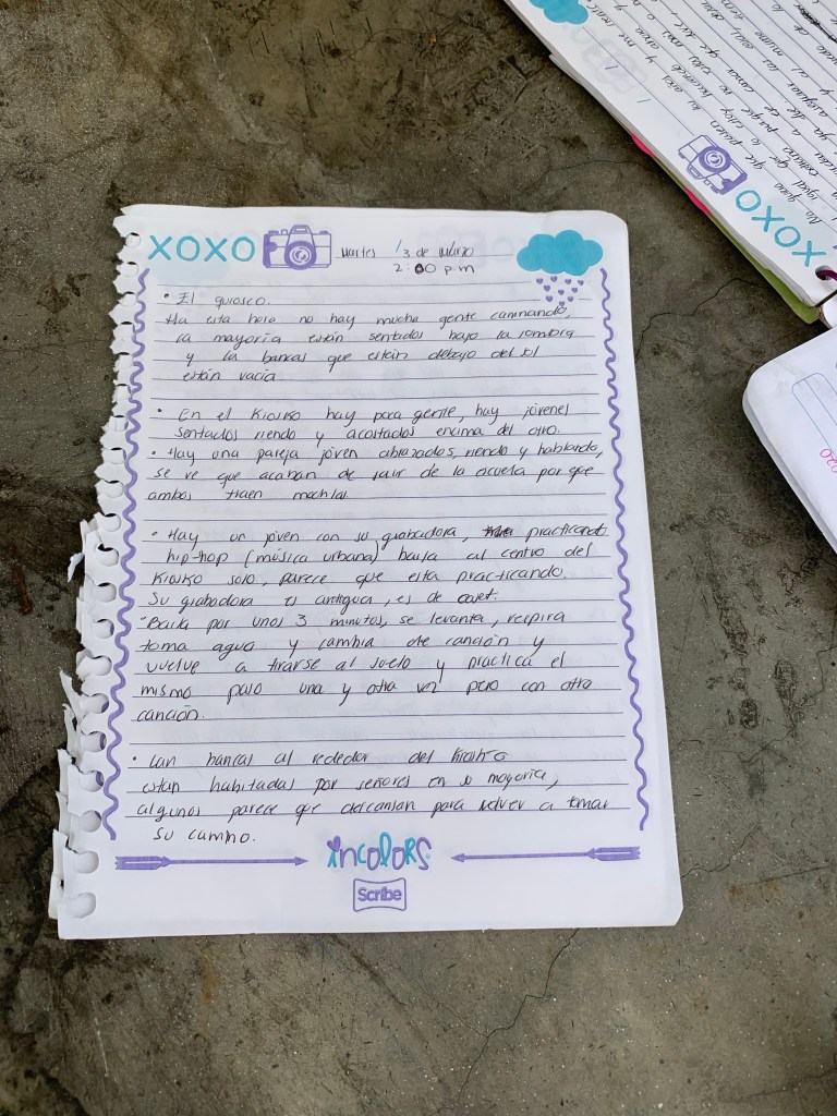 15:30 de la tarde. Cielo despejado con un sol abrasador. El termómetro marca 28°C. Llegue en metro. Salgo hacia Bellas Artes y me pono en la primer parte de observación. Me llevo una grata sorpresa. Camino unos cuantos metros y encuentro a un grupo de bailarines de rock and roll a un costado del palacio de Bellas artes. Bailan muy bien. Ponen canciones de los 50’s. La gente observa y algunos les dan dinero. Mientras, hay personas que se toman fotos con vista al Palacio. Terminan su actuación los chicos rockabily y yo me muevo hacia la Plaza del palacio a observar. Mientras camino por la plaza, me doy cuenta de que hay más gente que ayer. En su mayoría, calculo que es gente en un rango de edad de 18-30 años. También vi muchos más turistas y fotógrafos. También veo más parejas sentimentales y familias. Casi no observo grupos de amigos como ayer. La vestimenta es más casual. Hay menos tráfico de lo habitual en Avenida Juarez. Me muevo hacia el cruce con el Eje Central, frente a la Torre Latinoamericana observó las nuevas unidades de Trolebus de la ciudad. El cruce peatonal de Eje Central con Madero como siempre es abundante. En mi paso, veo menos personas con su celular. Se siente un ambiente más tranquilo, menos ajetreado de ciudad, a pesar de que hay mucha gente. Hay dos policías que orientan mucho a la gente que luego no se ubica donde están. Han tenido trabajo en ese aspecto. Frente a mi, en el edificio de Sears, observo un tumulto grande de personas, además de las que caminan por aquella acera de la avenida, pareciera que están observando algo en las vitrinas. A mi lado hay una familia numerosa, que le están tomando fotos. Se acercó otra persona con dos niñas a preguntarles si podían hacer una entrevista para una tarea, creyendo que eran extranjeros. Tienen el semblante jajajaja Muchas fotos hay. La familia es realmente numerosa. Incrementó el flujo de gente que camina por este lado en un momento. Se dirigen a la entrada del Palacio de Bellas Artes. De fondo, escucho la canción «A mi manera» y los silbatos de los agentes de tránsito. El flujo de gente aumentó considerablemente en un pequeño momento en los cruces de estas avenidas. Veo muchos jovenes y familias, principalmente. De aproximadamente 4 integrantes cada familia. Descubrí que «A mi manera» la está cantando un joven enfrente de mi. A mi lado, está una familia de 5 integrantes hablando del cantante. Le quieren tomar una foto pero son muy obvios. Son 15:53 me moveré a la entrada del Palacio a ver que observo, porque toda la gente va para allá. 15:55. Llego a la entrada del Palacio, me detuvieron a tomar una foto. Observo muchos vendedores de helados y paletas, un grupo de boleros refugiándose del sol, una señora vendiendo fotos al instante, y a un grupo de extranjeros con un guía, recibiendo la explicación del Palacio. Se observa que al interior hay mucha gente entrando al museo. Un niño con uniforme escolar se toma una foto. Hay una persona volando un papalote con forma de águila. Se me acerca un bolero ofrecerme sus servicios de nueva cuenta. Un poco más insistente que el de ayer. El sonido de las campanitas de helado también se escucha. Hay un organillero en tercer plano. Dos boleros se acercan a mi en menos de 5 minutos. Pasa una persona con un perrote muy bonito. Pasa una pareja que es detenida por un momento por un señor de sombrilla que la tiene al revés, creo que se le rompió uno de los agarres, los detiene un momento pero ellos no lo escuchan y se siguen. El señor está vestido con camisa rosa casual y pantalón azul. Detiene a otras dos personas y les explica algo. Ellos solo sonríen y voltean a ver al palacio. Un señor en silla de ruedas se me acerca y me pide dinero. El señor les entrega algo y ellos sacan dinero y se lo entregan. No distingo bien que les dio, pero se retiran después de haberles dado dinero. Se acerca a un grupo de personas el señor y comienza a hablar de nueva cuenta con ellos. Les ofrece un producto con bolsa azul, parece algo comestible. Por fin les llega trabajo a los boleros, los dos chavos que compraron por primera vez al de camisa rosa. Rápidamente los boleros se posicionan en su banquito y abren su cajón de bolero, una cajita con muchos productos adentro que se usan para el calzado, principalmente el formal. Y con energía lustran, tallan y engrasan los zapatos. Un bolero llega la vestimenta de un boleto antiguo, con sombrero tipo policía y traje blanco con negro. el otro es más joven, con vestimenta informal. Se acerca un hombre de raza negra con libros en su mano. Dice con un acento español peculiar de extranjero: «cerebro de pollo? Tu? Y señala a una chica que estaba sentada a lado mío, ella dice que no. Me señala a mi y lo ignoro un poco, dice después «no son felices porque no leen» y se aleja. Se vuelve a acercar otro bolero y lo rechazo. Un grupo de extranjeros llega enfrente de mi con otro guía que les explica la arquitectura del Palacio. Se vuelve a acercar el hombre de raza negra. Un extranjero con chanclas pasa enfrente de mi. Los boleros están a punto de terminar su trabajo y cobrar. El grupo de extranjeros entra al palacio. Llega una familia y se sienta a lado de mi, con dos niñas chiquitas. Su papá o su abuelo, se sienta a mi otro costado y quedo en medio. Me levanto y le digo que se siente junto a su hija/nieta. El fotógrafo instantáneo por fin tiene trabajo. El vendedor de helados continua vendiendo a la familia que llego. Escucho un altavoz muy fuerte a lo lejos, y Voy a moverme de lugar para seguir observando lo que escucho a lo lejos . Son las 16:16. Son las 16:18. Me moví a un punto más alto de la Alameda, cerca de una escultura ecuestre. Hay sombra y descanso un poco del sol. Llego cerca del sonido del altavoz, y efectivamente es una marcha de la Antorcha Campesina. Hablan del gobernador de Puebla. Hablan de respeto a la democracia y el estado de Derecho de México. Se acercan un grupo de personas