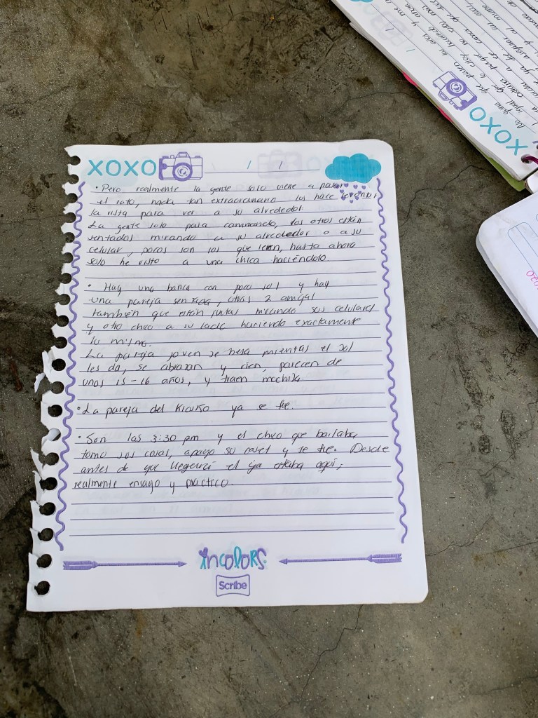 El flujo de gente es constante, típico de un fin de semana. En este momento, se sientan a lado de mi dos chicos, parecen ser pareja. Y una constante que encuentro en este lado de la plaza en especifico: hay demasiadas personas usando su celular. Muy curioso, mientras caminan, lo usan. Detenidos, lo usan. En grupo o individualmente, lo usan. Enfrente de mi hay un policía de la ciudad, cuidando el orden. El tráfico también es un poco pesado, por los semáforos. Encuentro un variado tipo de gente. De edades variadas, y creo que hay muchos turistas. De verdad todos están usando el celular en esta parte Se escucha reggaetón Se me acercó un bolero de zapatos…aunque yo traigo de gamusa. Detrás mío, hay dos chicos platicando sentados en el pasto. El semblante de la chica parece un poco preocupado, le pone atención al chavo, pero de repente se pierde su mirada. Tiene un tatuaje en su hombro derecho. El chavo ha hablado mucho. De verdad es impresionante la cantidad de gente que usa el celular mientras van caminando por este lado de la Alameda, hasta los niños. En contraste con los chicos que están platicando. Se retira la pareja que estaba a mi lado. Hay una chava que está usando hasta dos celulares a la vez Dios mío jajajaja Una chava se me queda viendo como pensando que hago aquí. La chica ahora está hablando y se nota que está como enojada, sus gestos denotan eso. Tiene los ojos hasta un poco rojos desde mi punto de vista. El policía ya se movió. He visto pasar dos personas en patines sobre esta parte y una en patineta, una en bici, y dos que ofrecen chips de celular, aparte de quien me ofreció la boleada. Se supone que está prohibido. Con el movimiento feminista, pasó una de ellas. Llevaba un paliacate verde y uno morado en su mochila. En su llavero, llevaba un silbato de auxilio. Traía cabello corto muy muy corto, estaba muy maquillada. Los chicos que están atrás platicando parece que están a punto de terminar su conversación. La chica se nota triste, enojada, está llorando, se le salen mucho las lagrimas, se abraza a si misma, se nota que esta pasando un momento difícil…hasta pareciera que están rompiendo su relación, está llorando mucho. Mientras, escuche a dos chicas hablando del paro que se va a hacer el lunes 9 de marzo. La chica de atrás mío está llorando mucho, niega con la cabeza, se toma sus manos, con fuerza. El chico parece un poco más tranquilo. Está tosiendo la chica. Un perrito se les acerca, y se mueve un poco más a mi. La chica llora de nuevo. Uno más con patineta pasa, agachado. El perrito sigue pasando. La chica está vomitando. Ambos se abrazan. Se quedan abrazados. Un trabajador de limpieza de la ciudad señala queda viendo. están recargados en un árbol. Pasa una pareja gay enfrente de mi. He notado a muchas personas usando playeras de diversos equipos de fútbol, especielmanere en hombres y niños. Termina el abrazo de ambos, la chica se trata de ir, el la toma del brazo y la regresa, ella lo ve de nuevo demasiado triste, se vuelven a abrazar. Ella se seca las lágrimas, el chico está más tranquilo. Ella llora mucho y lo vuelve a abrazar. Mi teoría se confirma: creo que están rompiendo su relación amorosa. Él está tratando de ser un poco más empático porque esta más tranquilo, ella llora mucho, lo mira a los ojos, estan muy cerca, parece que ella quiere un último beso de él, llora mucho, se abraza su estómago, mientras se acerca otra pareja a ellos. Él sigue platicando, ella lo sigue mirando tratando de buscar explicaciones, parece que no entiende lo que está pasando, le duele mucho y llora. Pasa otra chica con una bici frente a mi. Ella se acomoda su bolsa, aunque parece ser que le pesa menos ahora eso que el dolor que siente de dejar a esa persona. Por momentos se calma un poco, pero se abraza a ella misma mucho, como tratando de protegerse de lo que sucede. Pone cara de asombro, habla con el pero cuando habla no voltea a verlo tanto. Excepto cuando esta segura de lo que dice, ahí si lo mira a los ojos y espera una respuesta de su parte. Una pareja se sienta a lado mío. Mientras tanto, ellos siguen platicando. Un niño toma un puñado de tierra cercano a donde están ellos, lo toma y lo deposita detrás de una escultura, sin saber que fue en ese mismo sitio donde la chica triste vomitó. La otra pareja cercana a ellos se aleja. Regresa el niño a tomar el puñado de tierra que puso en la escultura, lo tira donde lo tomo. Su papá no observó que hizo toda esa acción por ir en su celular. Mientras, la pareja sigue hablando y la que estaba a lado de mi se retira. La chica de rojo voltea a verme ligeramente, yo volteo la mirada… se abraza mucho ella, se ve que no la está pasando bien obviamente. Se acerca una señora a venderles algo, ellos se niegan. La señora se acerca conmigo, no vendía nada estaba pidiendo dinero. No le entendí que me dijo pero no tengo para darle. La chica triste trata de asimilar lo que está pasando… El chico le da un beso en el cachete, ella trata de sonreírle, se abrazan y vuelve a llorar. Se aleja de el y viene cerca de mi. Tomaron rumbos opuestos, literalmente… ella hacía avenida Juarez, el chico hacia Av. Hidalgo. La chica se cruza la calle y está apresurada, va triste, se le nota en su caminar…se sienta en una banca del otro lado de la calle. Y terminada esta escena, yo me muevo porque el calor está horrible despues de 40 minutos sentado aquí. La chica está sola, se suena su nariz, le pregunta algo a dos señoras que están a su costado. El perrito parece haberla seguido, ella solo lo acaricia ligeramente y suelta una ligera sonrisa. Esta ahí sentada, sin saber que hacer…solo observa hacia el frente y el paso de las personas, algo parecido a lo que hago yo. No se si acercarme… La señora y su hija le dan algo y ella lo agradece. El perrito se acerca de nuevo, y ahora le hace más caso. Vuelve a perder su mirada…parece que come algo que le dieron la señora 